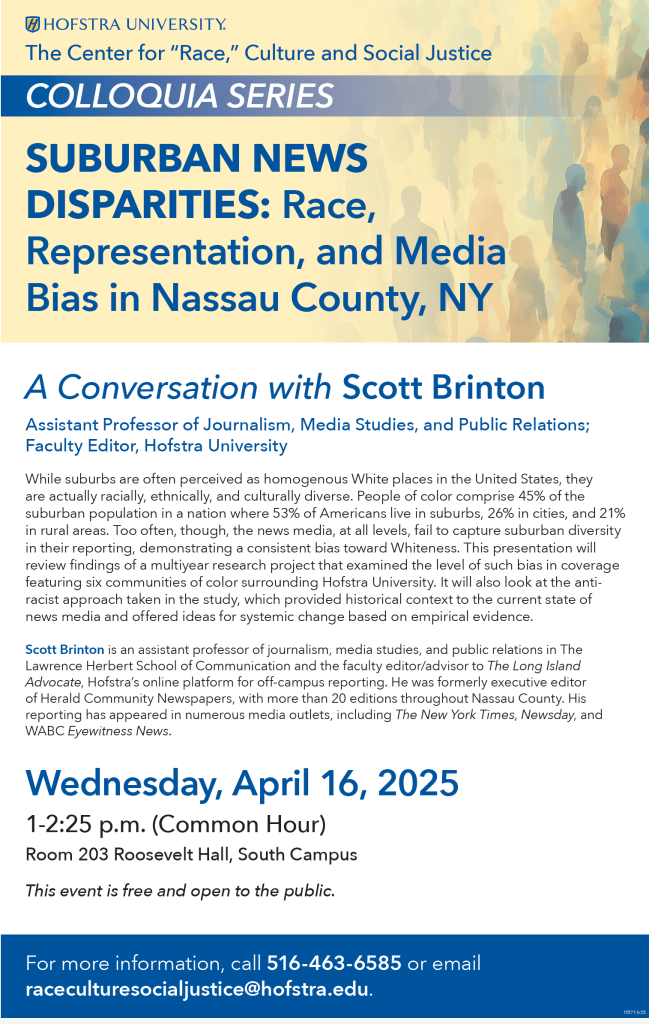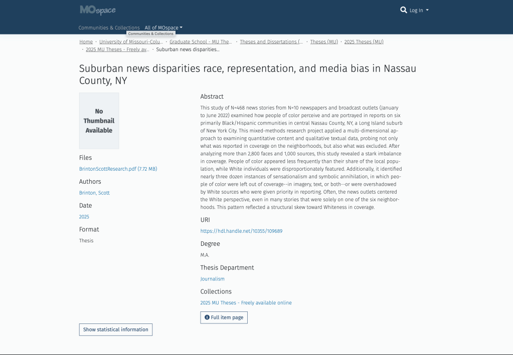 MOspace, University of Missouri, 2025 — A mixed-methods investigation of suburban local news coverage examining how race and geography shape reporting priorities in Nassau County, NY. This sole-author study combines a quantitative content analysis of hyperlocal print and broadcast coverage with qualitative textual review to assess disparities in story volume, framing, sourcing, and subject emphasis across communities. Findings show that communities of color receive less sustained civic and resource-focused coverage and are more frequently associated with crime-centered narratives, reinforcing structural inequities in information access. This project offers data-driven recommendations for improving equity, accountability, and community representation in suburban journalism.
