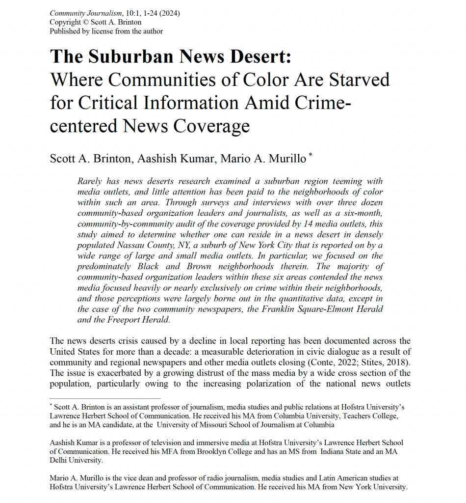 Community Journalism Journal, 2024 — A mixed-methods study of local news coverage in Nassau County, NY that analyzes race-based differences in reporting volume, story framing, and sources. Includes interviews with community representatives and journalists, a dataset of crime coverage, and policy recommendations to improve representational equity.