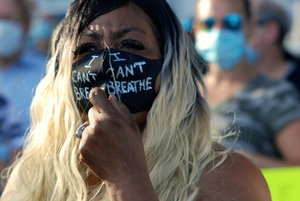 Protesters assembled at the Merrick Long Island Rail Road station prepared to march. Within minutes, they had shut down Sunrise Highway west of the station. At front was Adriana Brutus, 20, of Elmont. “I’m scared every time I come outside,” she said, crying. // Photo by Scott A. Brinton/Herald Community NewspapersRita Moore, of Lindenhurst, who grew in Wyandanch, raised protesters’ spirits with an impassioned speech at the Merrick Long Island Rail Road station. // Photo by Scott A. Brinton/Herald Community Newspapers When confronted by Nassau County Police, a mother wrapped her arms around her son to help shield him during a protest on Merrick Road in Merrick. // Photo by Scott A. Brinton/Herald Community Newspapers