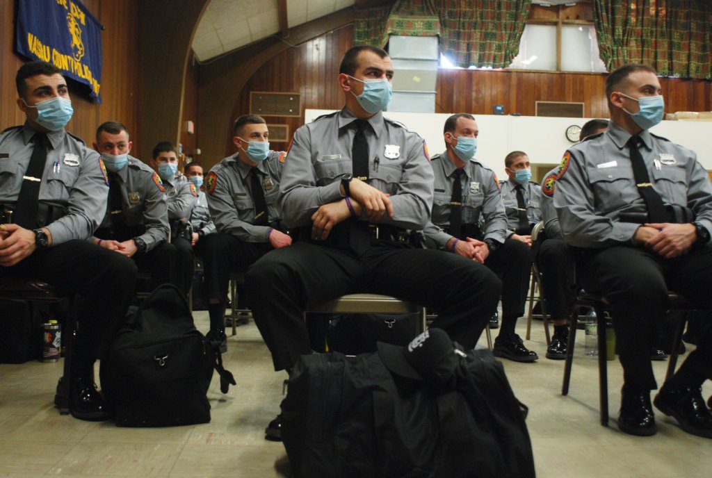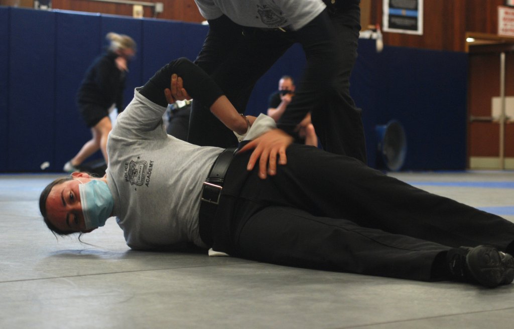 On a Thursday in 2021, Nassau County Police Academy recruits watched films of police field work. With their instructors, the recruits analyzed the tactics employed step by step.For security reasons, recruits could not be identified by name. // Photo by Scott A. Brinton/Herald Community NewspapersRecruits took their Defense Tactics exam, demonstrating the proper methods to arrest suspects. // Photo by Scott A. Brinton/Herald Community NewspapersDuring the Defense Tactics exam, every hand hold was scrutinized by examiners. // Photo by Scott A. Brinton/Herald Community Newspapers